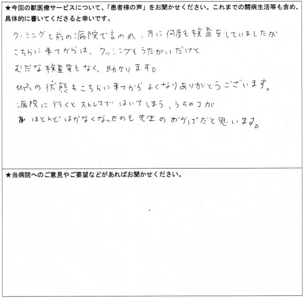 クッシングと前の病院で言われ、月に何度も検査をしていましたが、こちらに来てからは、クッシングもうたがいだけとむだな検査等もなく助かります。